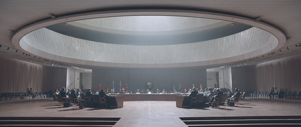 We wanted to create an aesthetic that felt plausible. It was integral that the piece felt like it could be some form of United Nations meeting, so we aimed for naturalism with a soft but directional light from above. Because of the speed at which we had to work, I decided to try and have no lamps on the floor and did all my lighting from above. I used textiles and bounced sources to maneuver quickly and utilized the architecture of the space itself to help me light it. I also used a balloon up in the middle to help maintain ambience. It was great fun, but very physical as well because it was a single camera shoot.